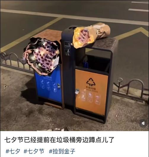 七夕当晚,有网友表示已经提前在垃圾桶旁蹲点,希望能捡到被丢弃的鲜花、蛋糕、饰品甚至贵重礼物。